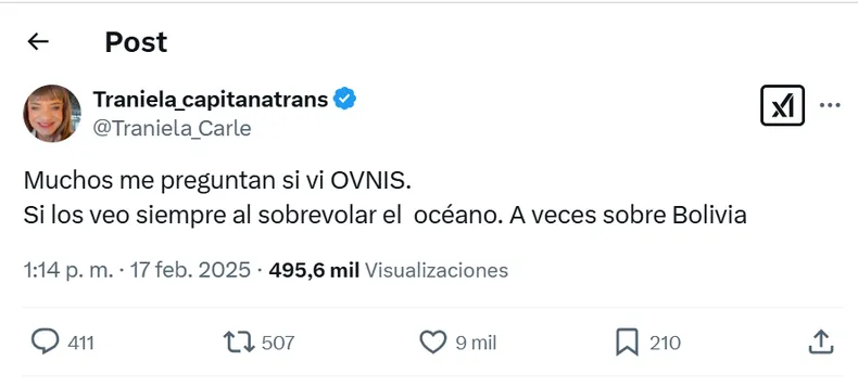 En su cuenta oficial de X, @Traniela_Carle, la capitana compartió un mensaje a sus seguidores: “Muchos me preguntan si vi OVNIS. Si los veo siempre al sobrevolar el océano. A veces sobre Bolivia“. El posteo juntó más de 9 mil “me gusta” y generó cientos de comentarios.